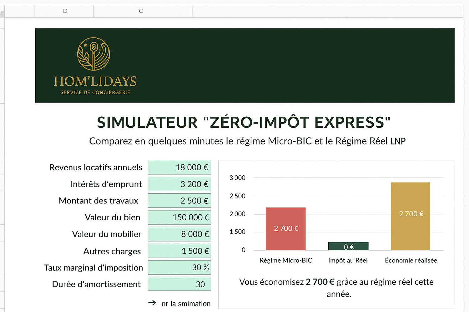 Un calculateur fiscal maison, conçu pour les LMNP, qui vous indique en 5 minutes si le régime réel est plus intéressant pour vous (en prenant en compte loyers, charges, mobilier, intérêts, travaux…).